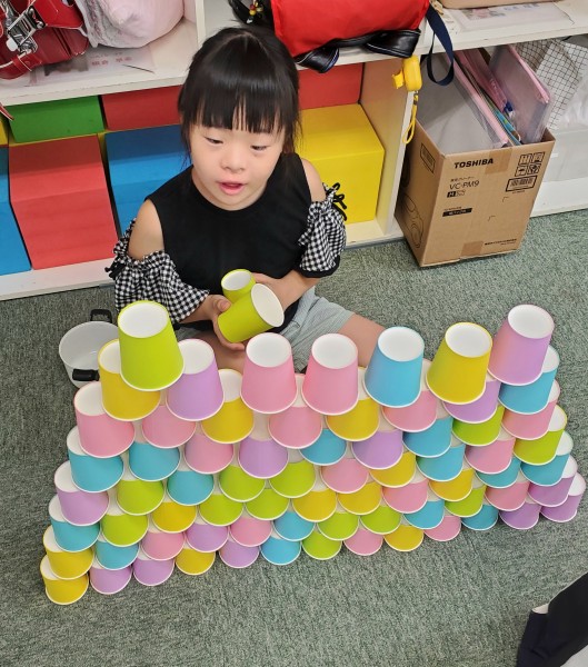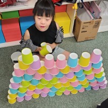 カラーの紙コップタワー、まだまだ高くなるよ!