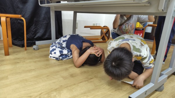 地震想定の避難訓練をしています。机の下でダンゴ虫のポーズ!