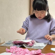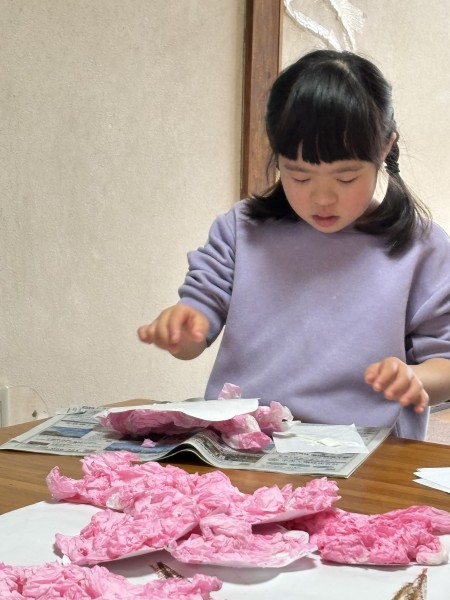 桜の制作をしました。絵具でピンク色に綺麗に染めることができました。